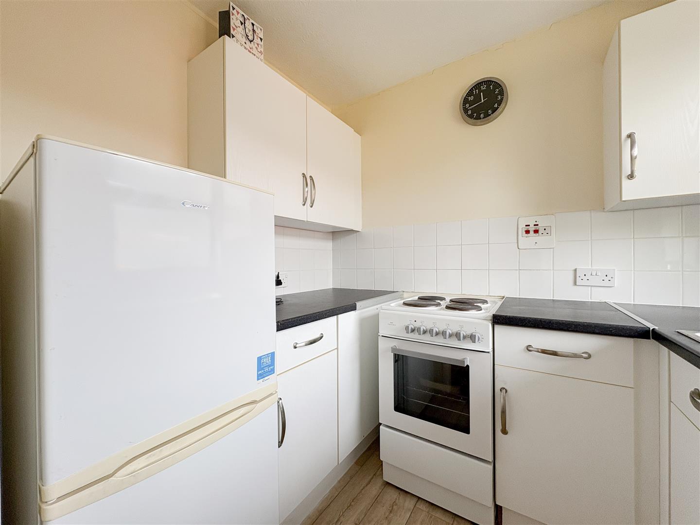 The property comprises a spacious living/bedroom area, a modern fitted kitchen including a freestanding electric cooker and fridge/freezer, and a newly fitted bathroom with a white suite and shower over the bath.